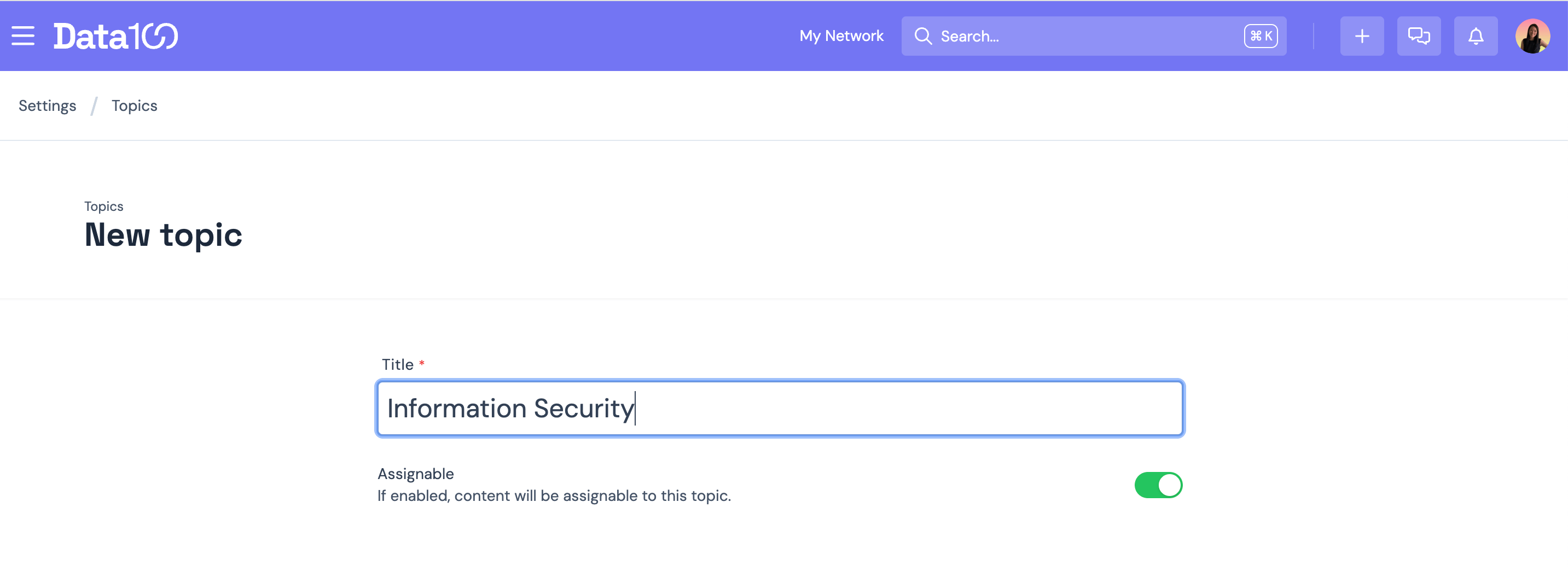 Add a title and decide whether the Topic is assignable to content