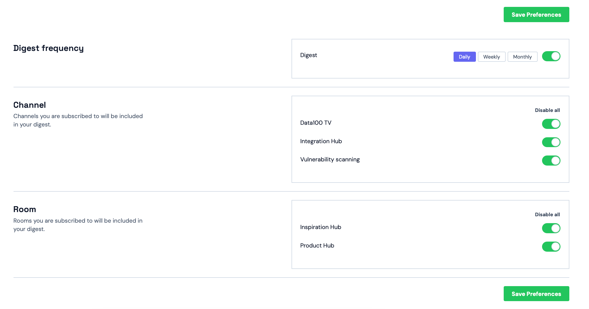 Alternatively, users can decide which channels and rooms to watch in their 'Your Digest' page, under 'Account Settings'. Notably, if no content is added to the channels and rooms that users are watching, the Digest email will not be sent.
