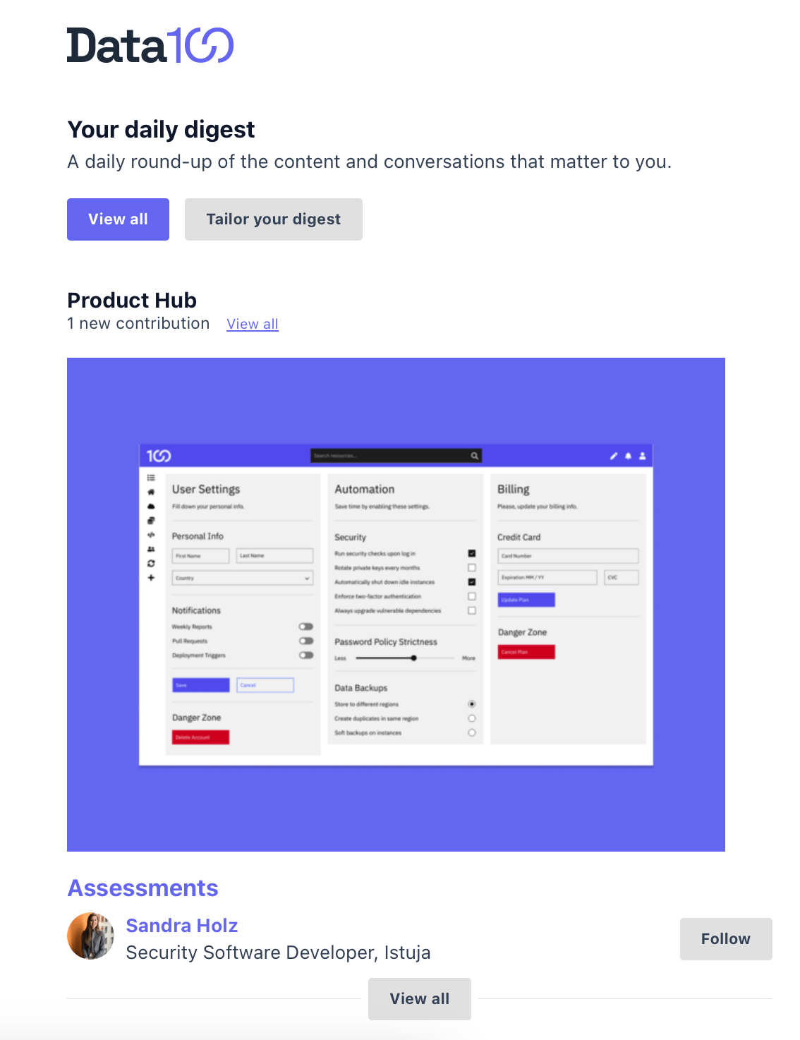 The Digest is a feature that enables users to stay up to date with the content and conversations that matter most to them. It allows them to 'watch' the channels and rooms they are most interested in, and be notified by email about new content and conversations at a frequency of their choosing. You can prompt users to watch channels and rooms during the registration process.