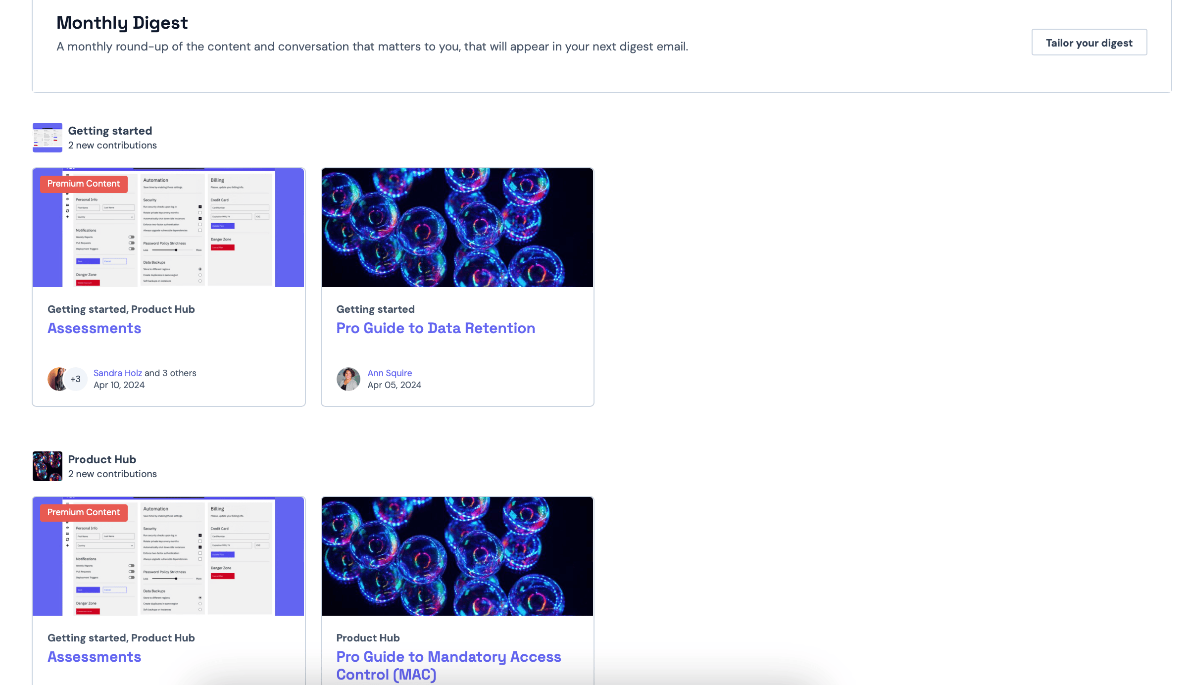 Lastly, users are always able to view their 'My Digest' page, which they can access by clicking on their avatar image on the top-right corner of any Zapnito site. In this page, users will see a monthly round-up of the content and conversations that matter the most to them.