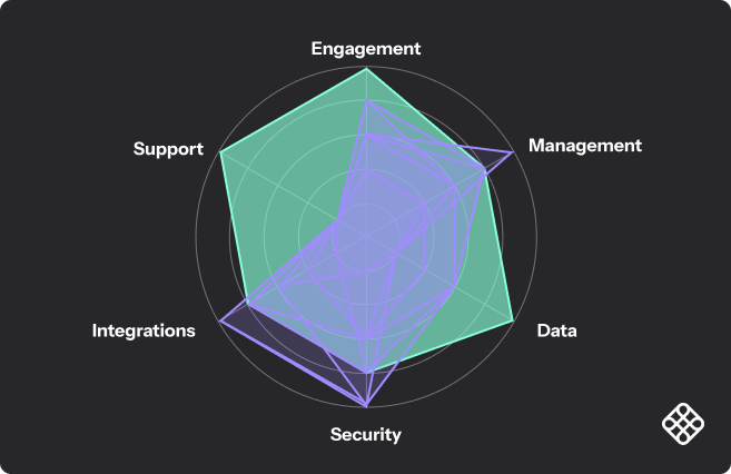As you can see by the graph comparing different online community solutions, Zapnito (highlighted in red) is the best all-rounder. Some online communities may not need this level of enterprise-grade functionality and support, but for B2B brands, this comprehensive offering provides everything needed drive long-term impact.