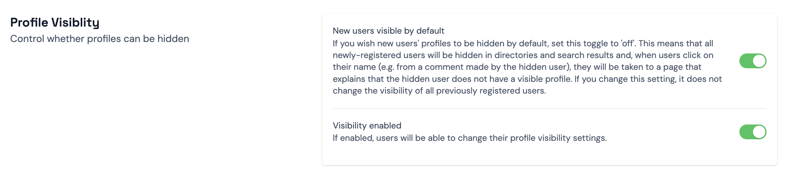 Here you can click the toggle to choose whether you want the user’s profile to be visible or hidden from directories and search results (don’t forget to hit save once you’re done).