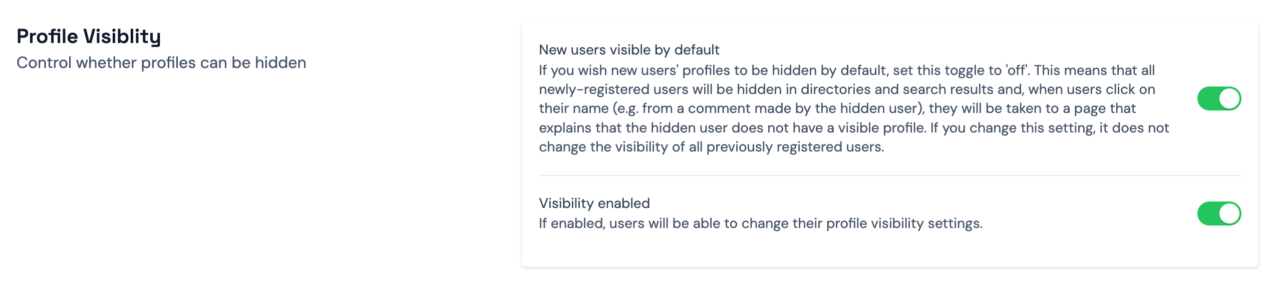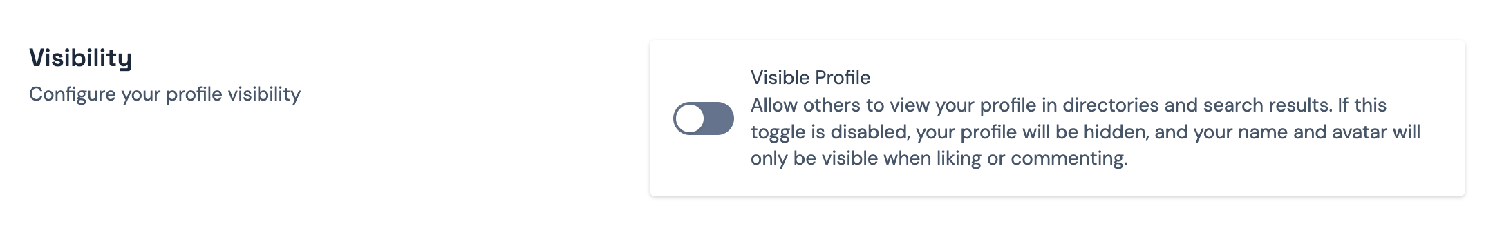 Here you can click the toggle to choose whether you want the user’s profile to be visible or hidden from directories and search results (don’t forget to hit save once you’re done).