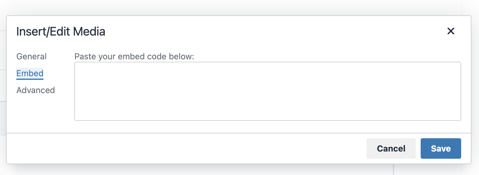 In the post editor, scan across the navigation bar for the Insert/edit media button, where you will be presented with the 'Embed' option. Before you insert the code, make sure you have selected the exact place in the post in which you would like the embedded content to appear.