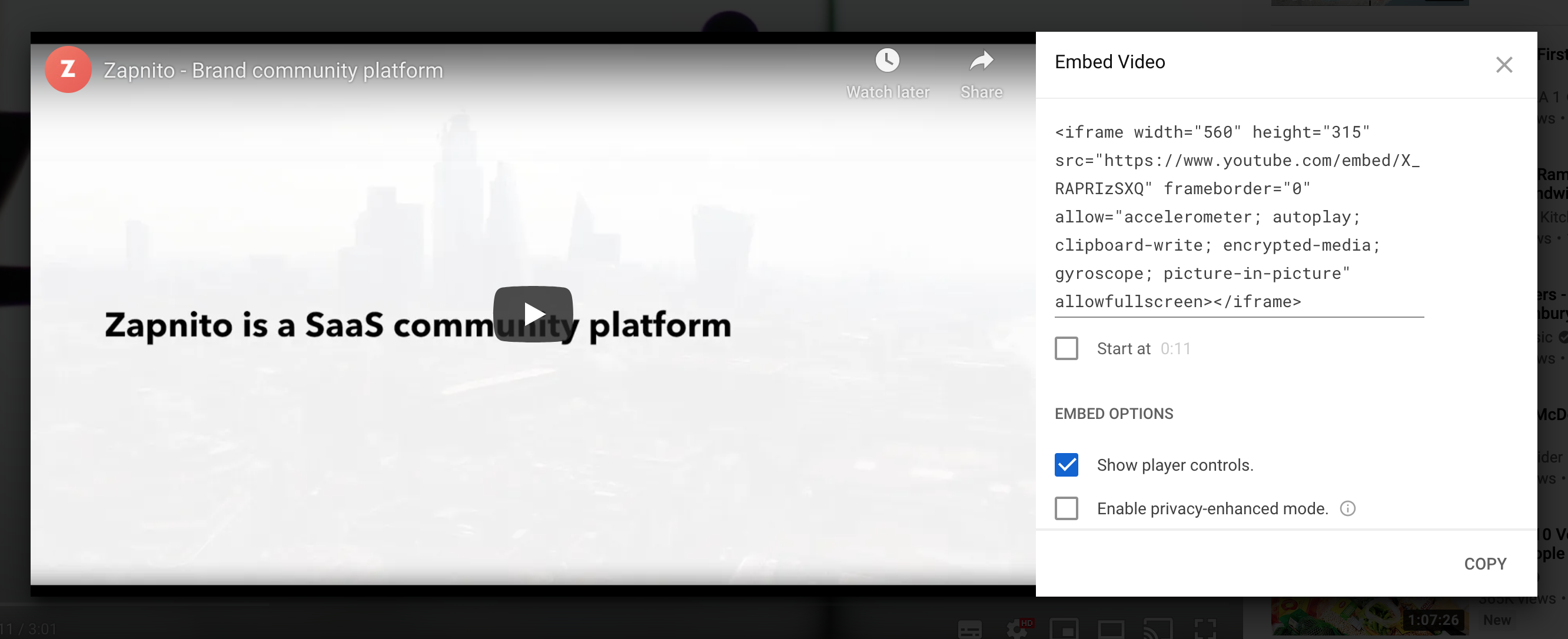 Click the Share button below the video and select 'Embed', which will allow you to copy the embed text.
