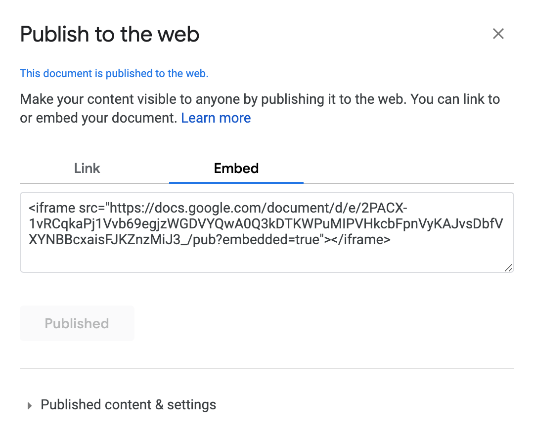 It is also possible to embed Documents, Sheets and Slides directly from your Google Drive. In the desired file, at the top of the page select File and Publish to the web. In the window that appears, click Embed.