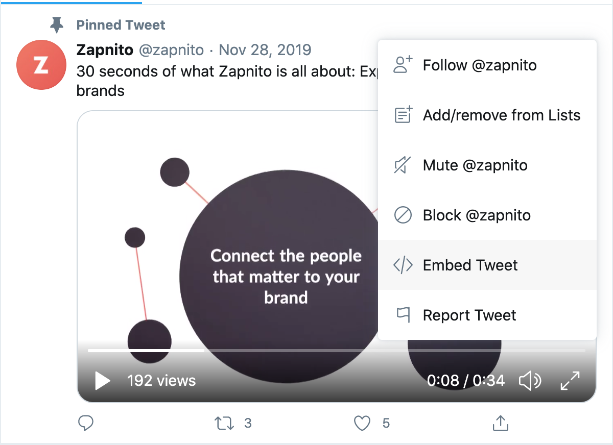 On the post you wish to embed into your Zapnito content, click on the three dots in the top right-hand corner and select Embed Tweet, which will enable you to copy the code to your clipboard, whilst displaying a preview of what the embedded post will look like.