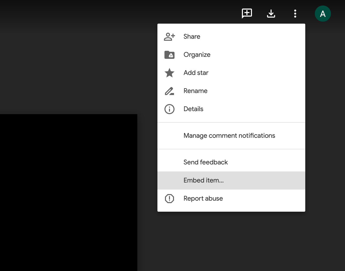 If you would like to embed a video from your Google Drive, you will first need to open the video file and click the three vertical dots in the top right-hand corner of the page. This will give you the option to Open in new window.