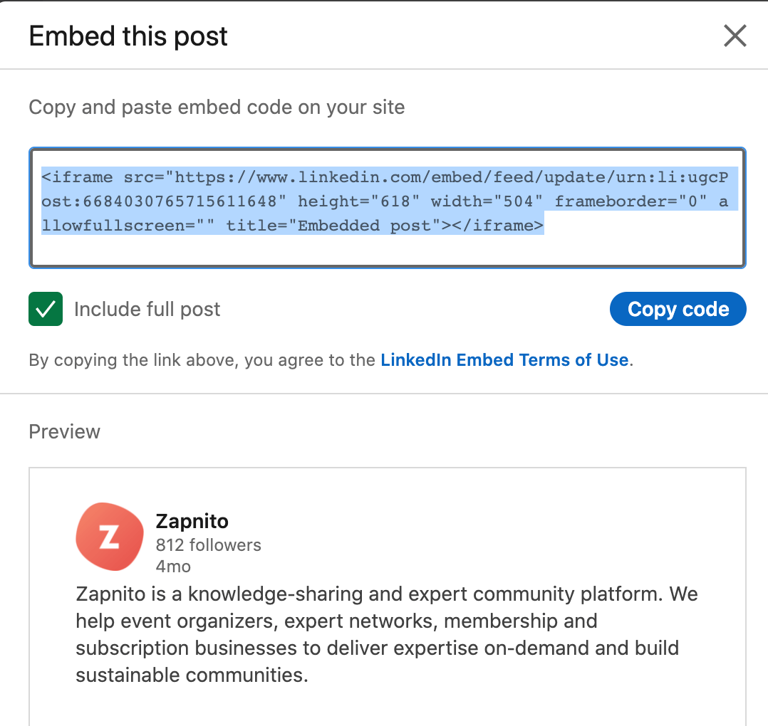 Similarly, for LinkedIn content, you can embed a post by clicking on the three dots in the top right-hand corner and selecting Embed this post.
