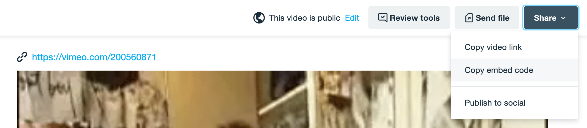 On the video edit page, click the Share tab in the top right-hand corner of the page and select Copy embed code which will copy an iframe code to your clipboard.