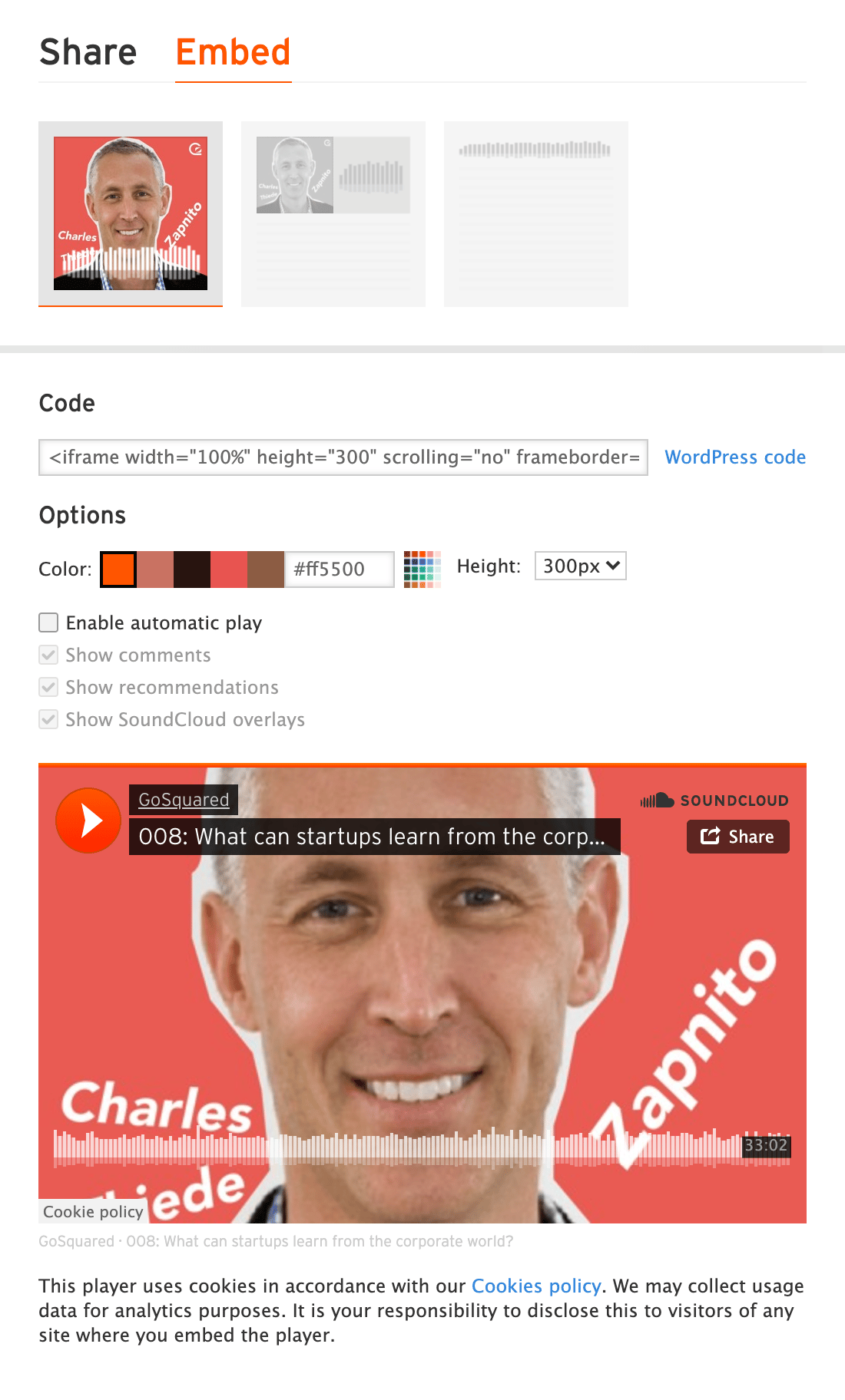 To generate an embed code, click the Share button below the waveform, then select the embed tab to view what options you have to embed your player.