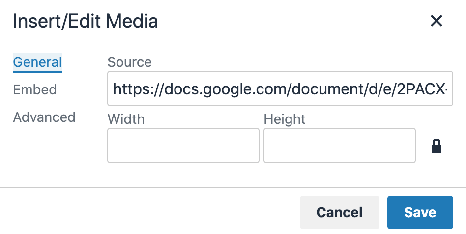 It is also possible to embed Documents, Sheets and Slides directly from your Google Drive. In the desired file, at the top of the page select File and Publish to the web. In the window that appears, click Embed.