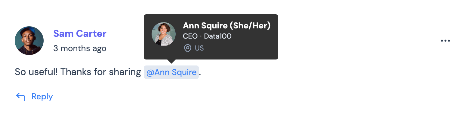 Hover card over a person's name (@mentions in comments)