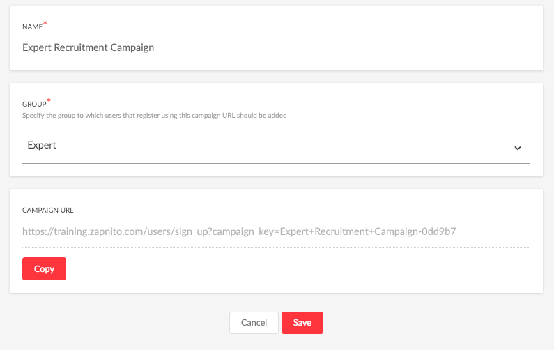 Give your campaign a name and then specify to which group users should be added when they register with the URL. Once you have selected a group, the campaign URL can be created. Click the ‘Copy’ button to save the URL to your clipboard.