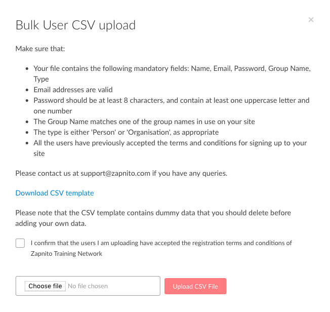 You should only use this feature to invite users who have already accepted to be invited to your community or who have otherwise agreed that they are happy to be added to the community in this way. Users will still need to accept the terms & conditions of your community after they have been invited. Once you have uploaded your file, follow the steps on the screen to process your file. You will receive an email confirmation of whether your file has been processed correctly.