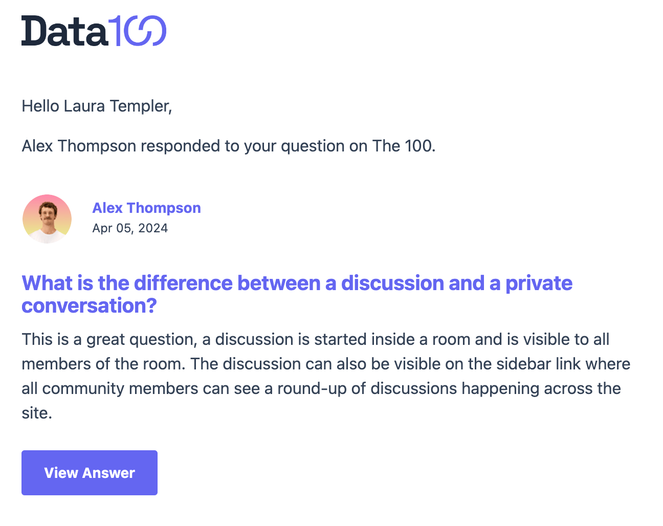 The recipient clicks on the View Answer button, in the email (or visits the Q&A page) to view the answer in full on the community site. If they find the answer useful, they can upvote it to bring it to others’ attention.
