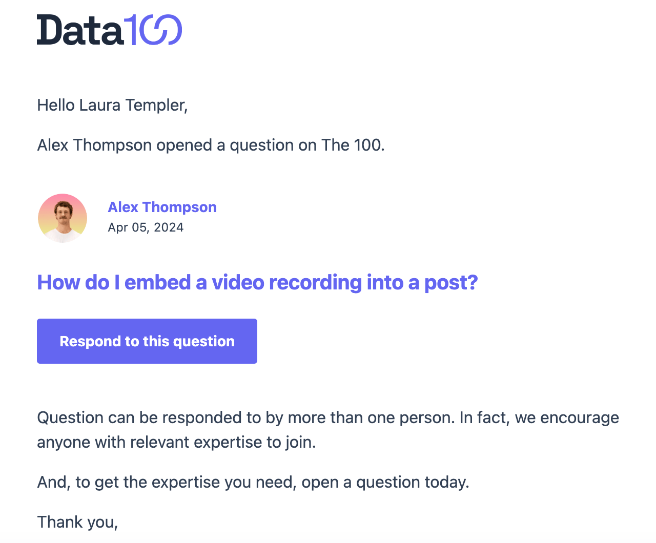 The question now appears on the Unanswered Questions list on the Q&A page. The email contains the question and invites the recipient to answer it. They can do so by clicking on the link in the email or by visiting the Q&A page and clicking on the question they want to answer.