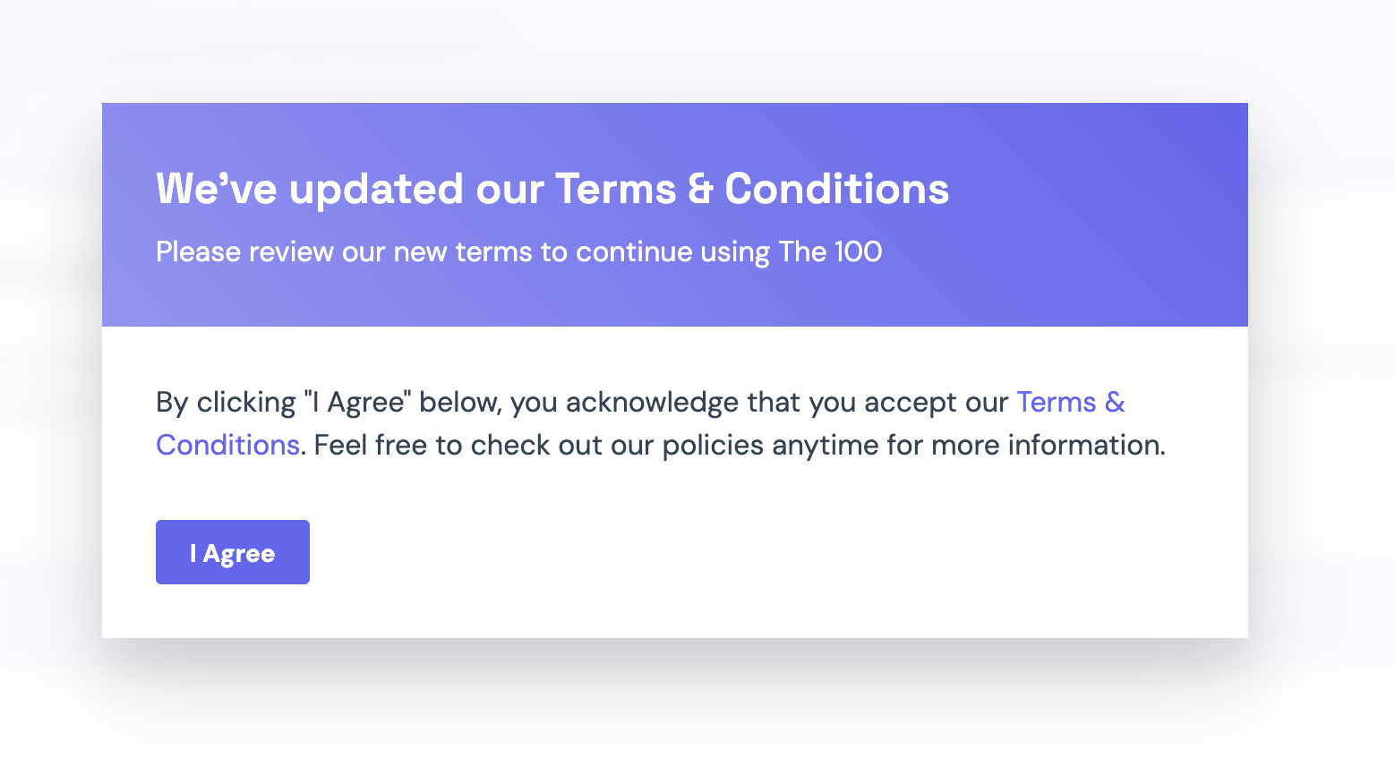 - Any user that has not accepted these updated terms sees a popover modal asking them to accept them, the next time they sign in to the site