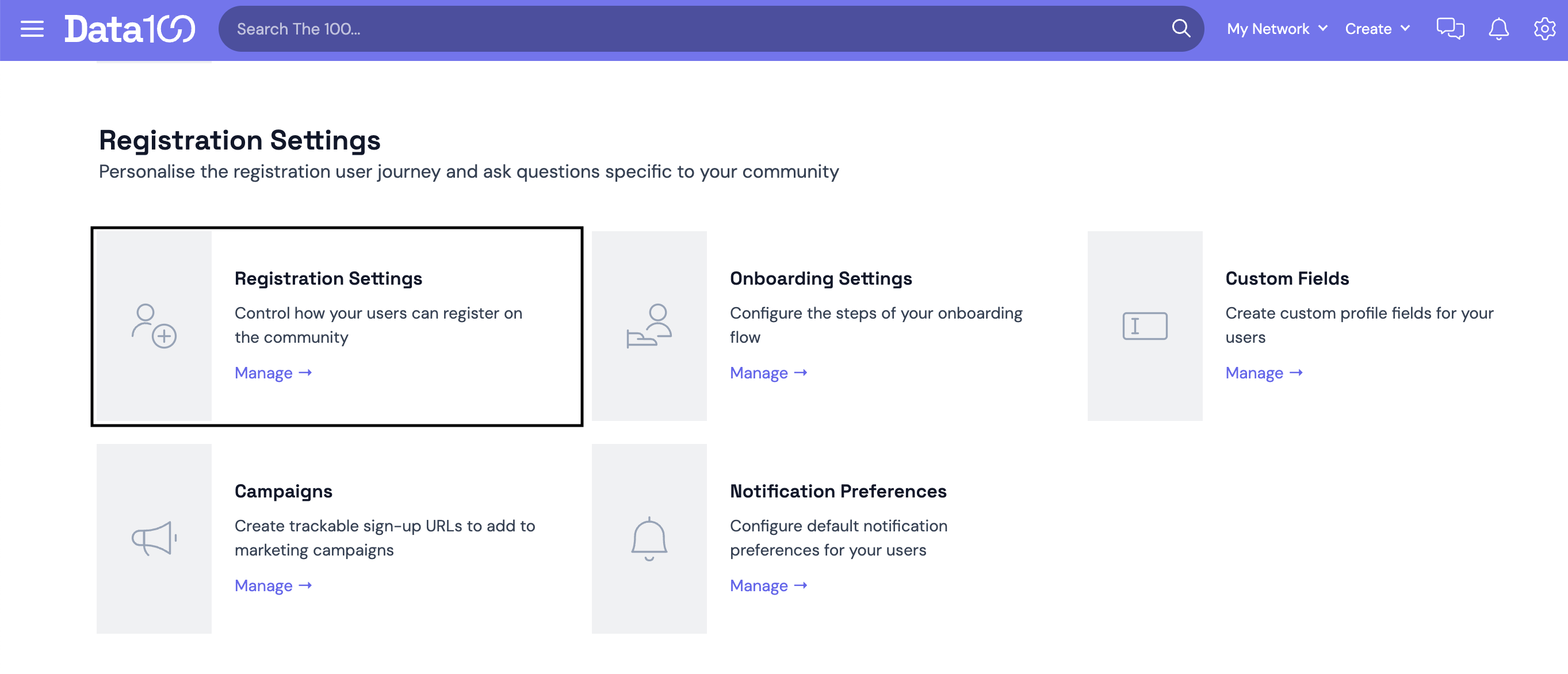 When you update your terms and conditions and want to tell users about it, you can choose to set an effective date for your site T&Cs. To do this, head to the cog in the top right-hand corner of the page and click Settings. Scroll down until you find the 'Registration Settings' tile.