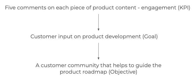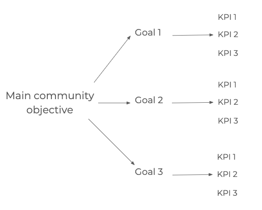 Once you've identified the main objective of the community, we need to break it down into bite-sized goals that you can track. These smaller goals should each demonstrate value for the business; the value doesn't need to be financial but there should be a clear link between tracking the goal and the benefit for the company.