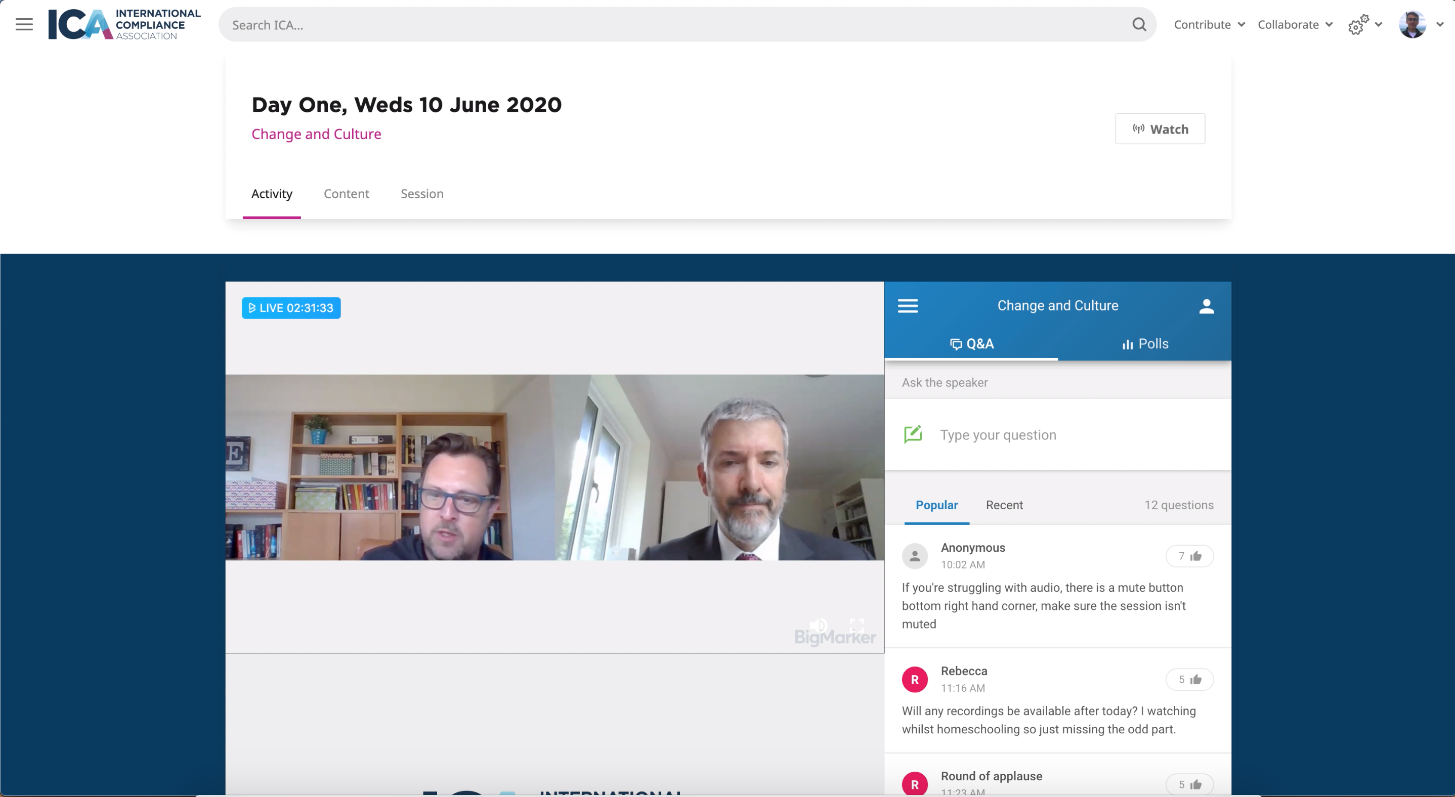The ICA are a shining example of building a community around an event. The BIG Compliance Festival takes place over several dates throughout the year, making it important that attendees feel incentivized to return after their first visit. Event sessions remain available on-demand long after the event, extending the audience reach and keeping the conversation going.