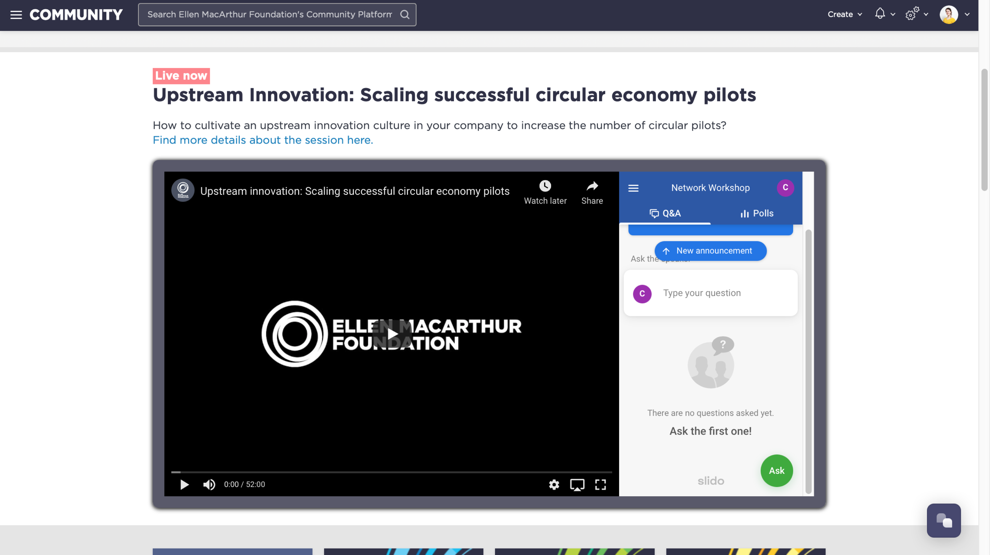 You first need to hold your video call on a separate platform such as Zoom or Microsoft Teams. You then need to set up an RTMP encoder in order to embed this live video on your community. For audience interaction, simply embed Sli.do - an easy-to-use app that allows audience interaction and polling.